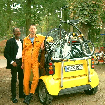D. (Scharbeutz, Germany) Lieferung seines Mini-Hochrads [ im orangenen Overall: H. Marcard ] (September 2001) |